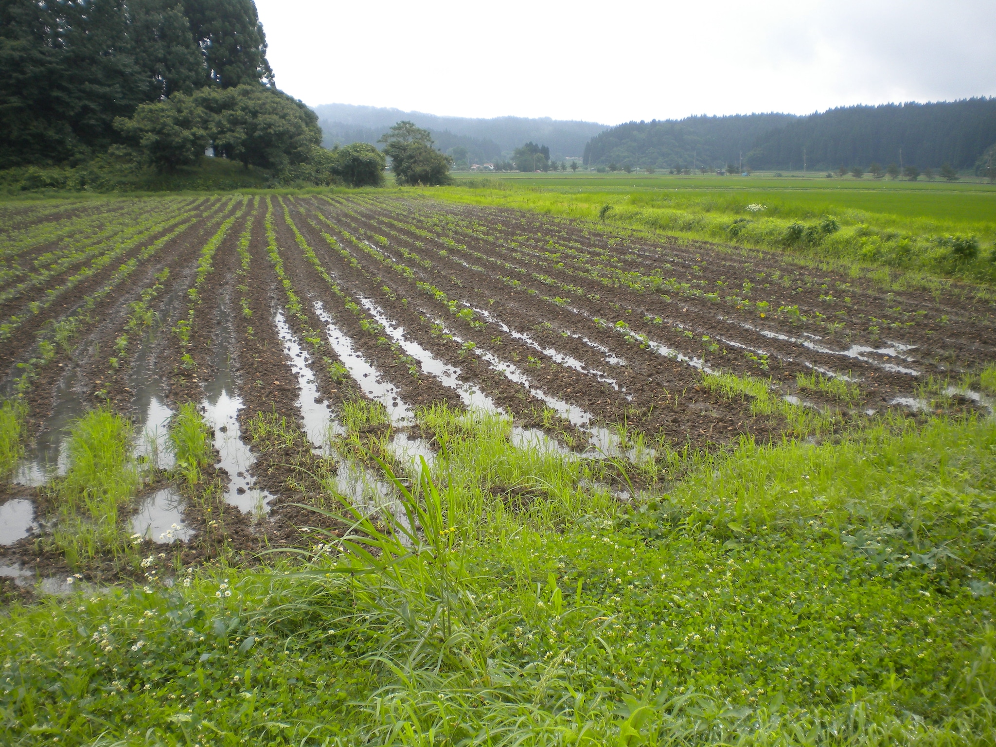 そして大雨により大豆畑の上にある堤は決壊し、大豆畑に浸水しました。